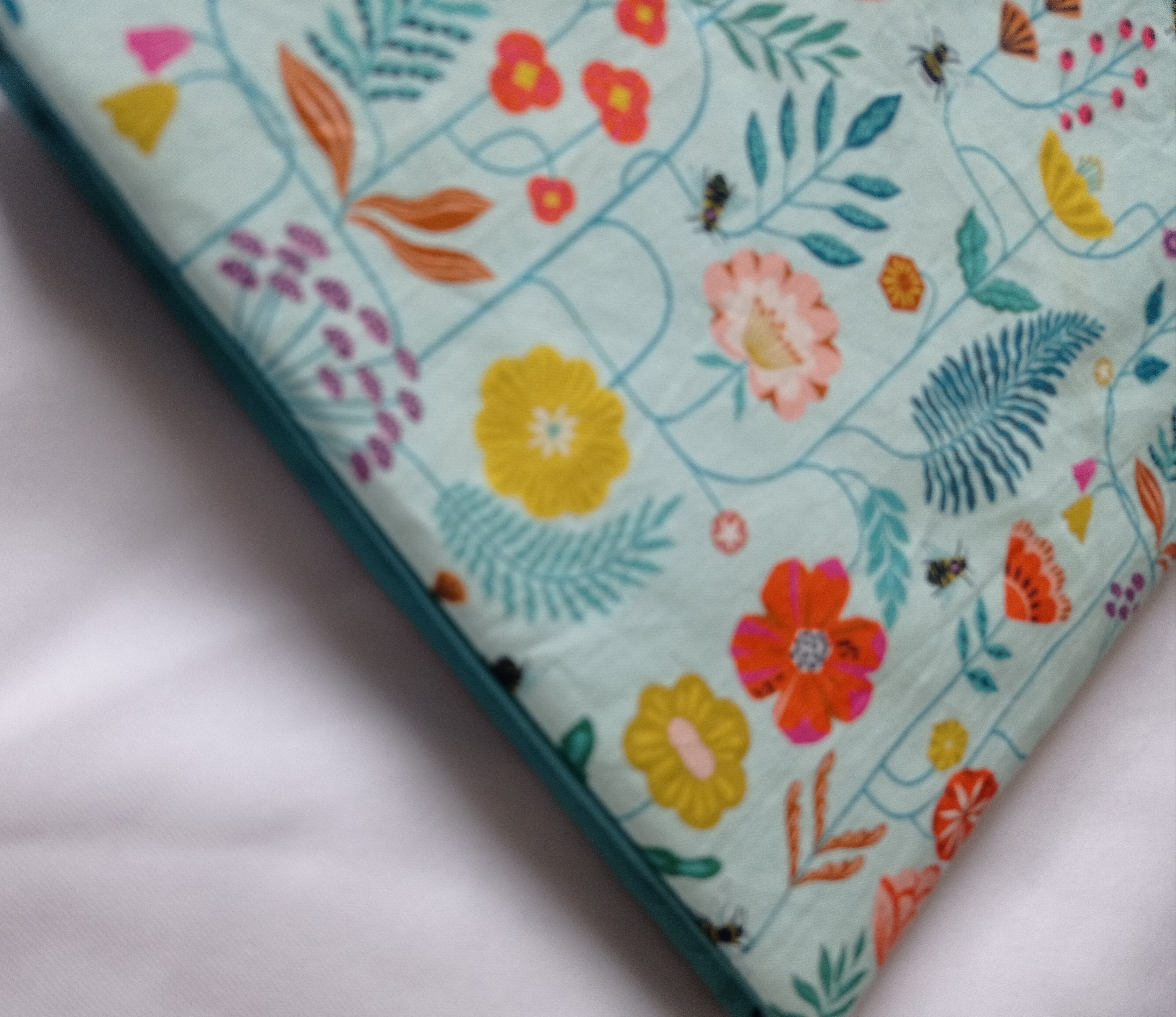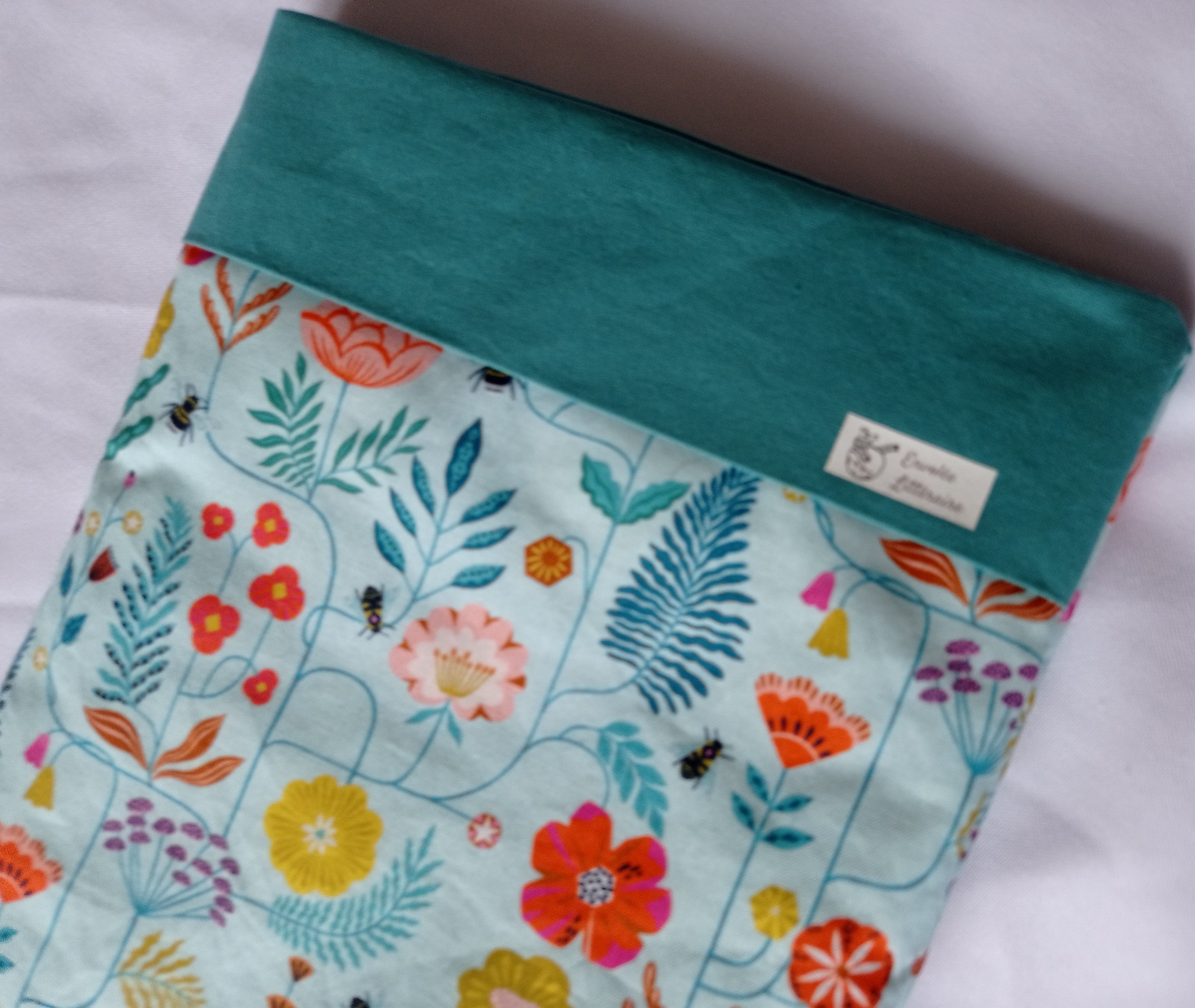 Pochette aux motif de fleurs et abeilles fond bleu clair.