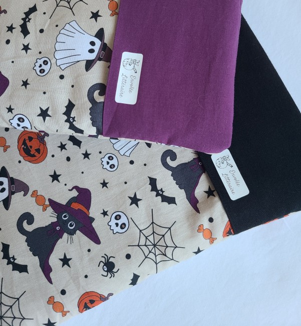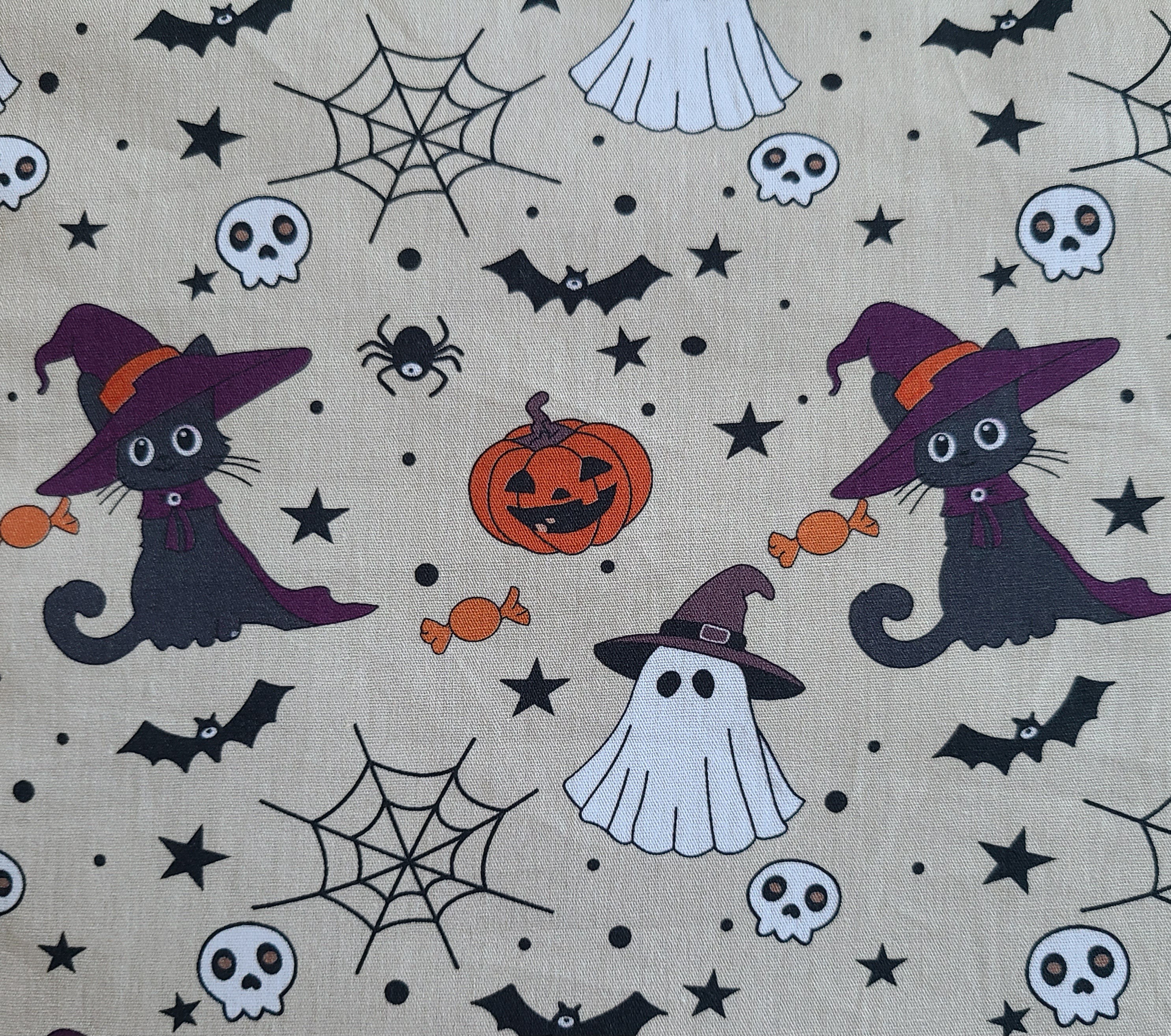 Motifs d'Halloween, chat, fantôme, citrouille.... fond ecru