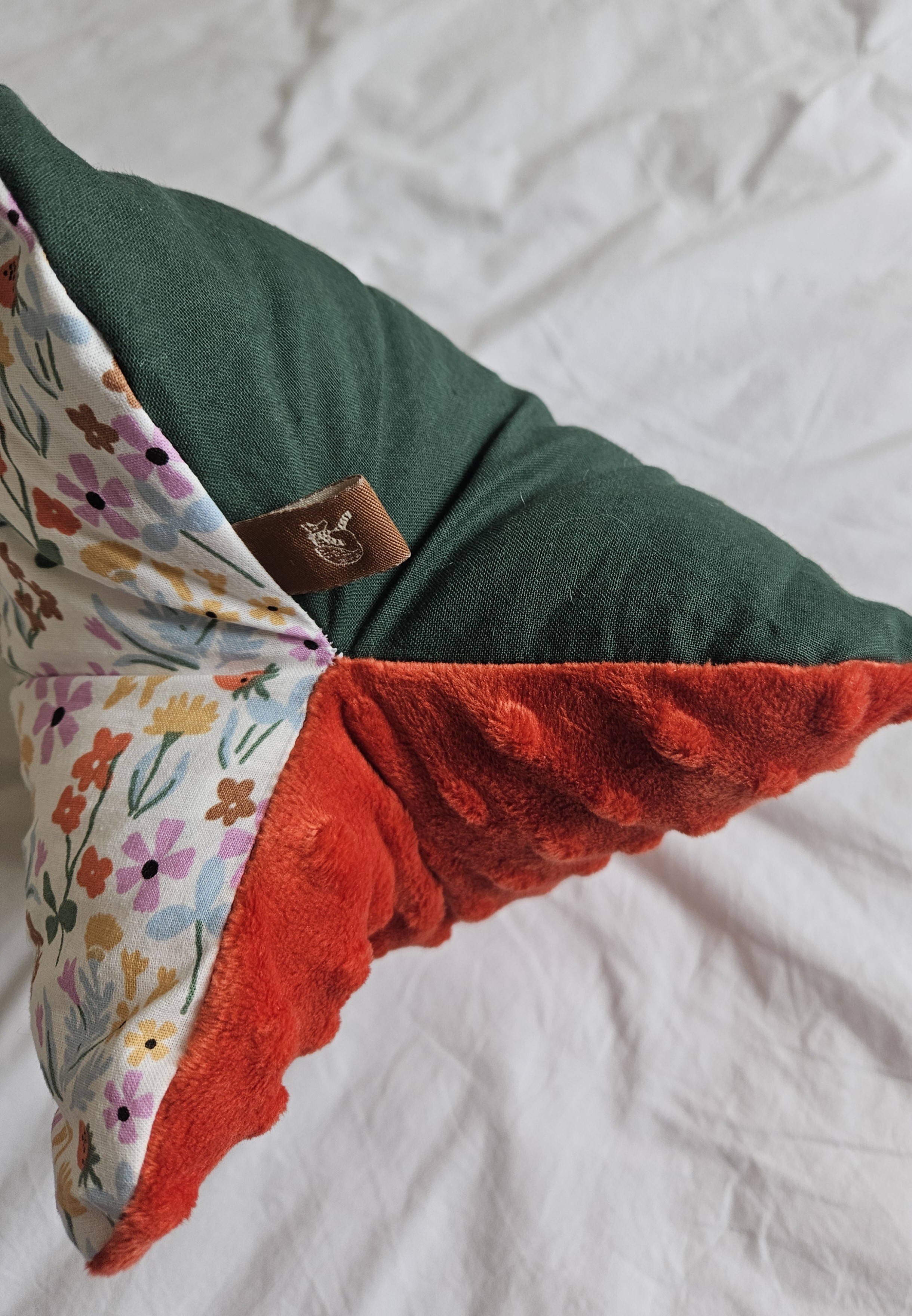 Coussin de lecture avec trois tissus différents (Cotons, Minky), intérieur en fibres polyester. Lavable à 30 °C